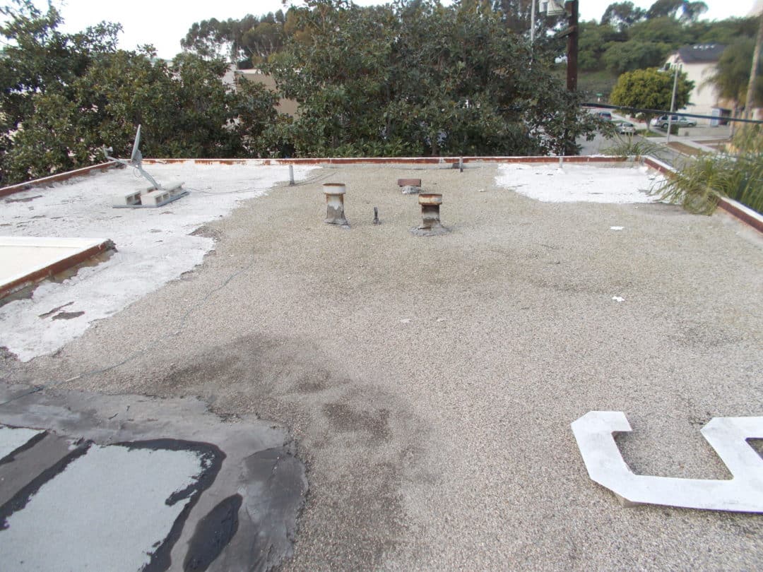 The owners of this apartment building had previously contracted with several different roofers in an effort to fix the re-occurring leaks. Unfortunately, no roof repair lasted long. Prior to the installation of the SureCoat Roof System, this roof was repaired with several different products. In one large area of the roof, the gravel was swept away and coated with an inferior white coating. The owner had been persuaded to use an expensive silicone product that by all accounts was installed correctly only to discolor and blister. This compounded their roof leak issues as no other roof coating would stick to the blistered and peeling silicone surface.